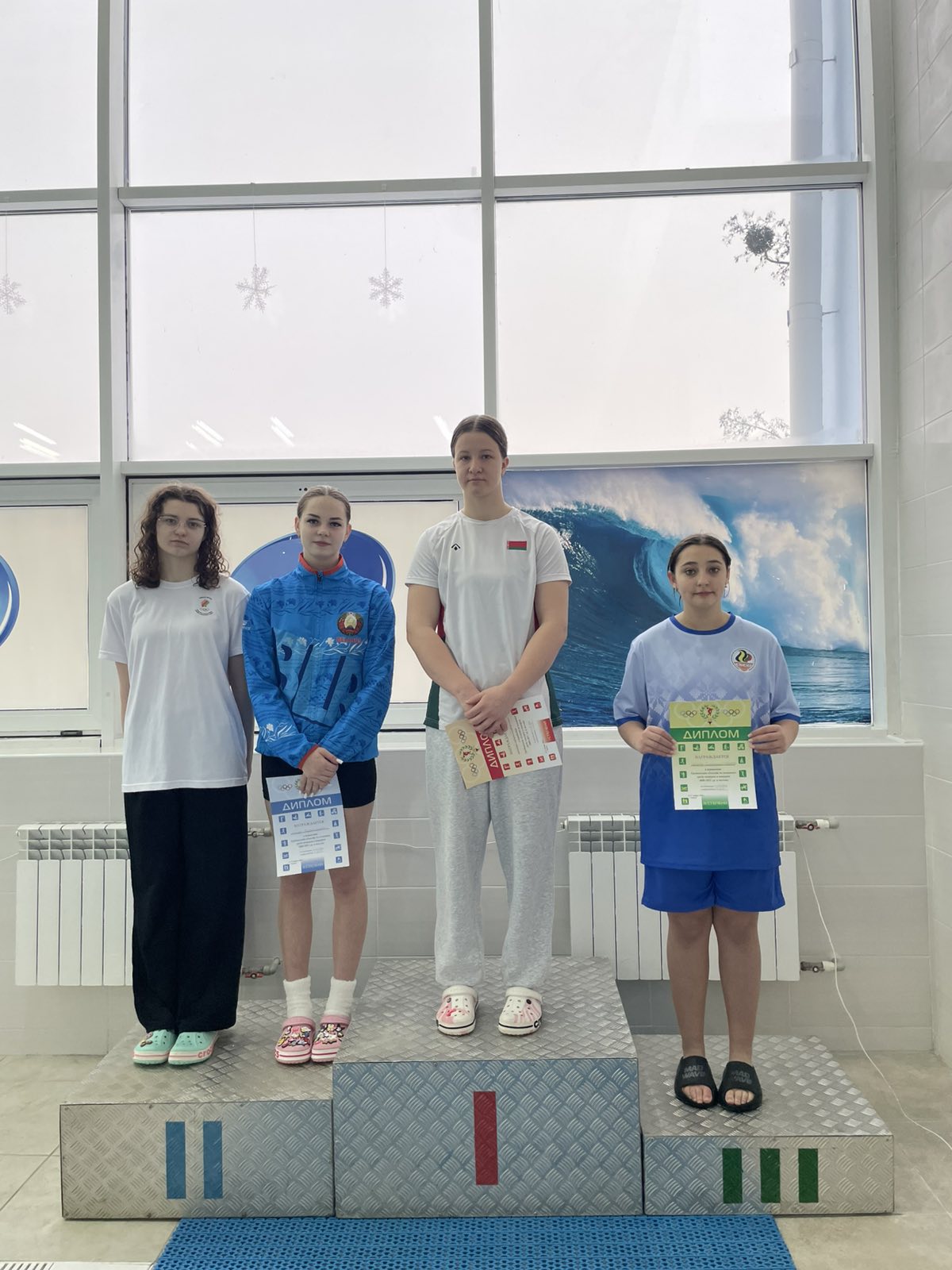 В эстафетном плавании 4x200 м вольный стиль заняли III место команда девушек: Чижевская Александра, Дворцова Дарья, Адамович Алиса, Курец Евгения.